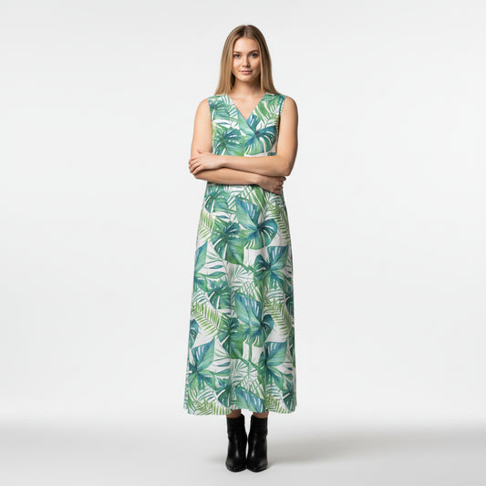 V-Neck A-Line Palm Dress in White Organic Cotton Twill