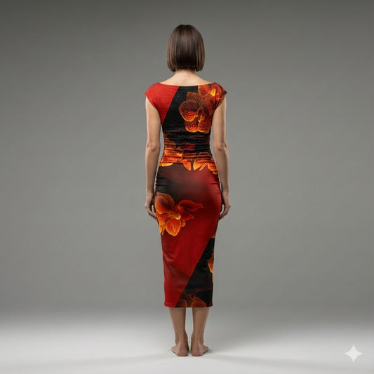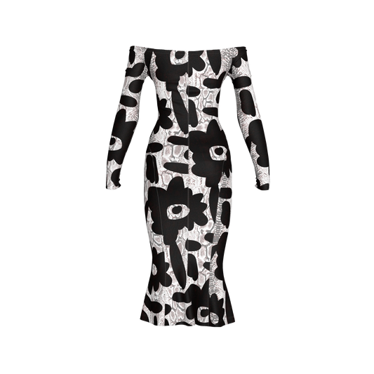 Black Flower Off-Shoulder Jersey Dress with Side Contour Panels