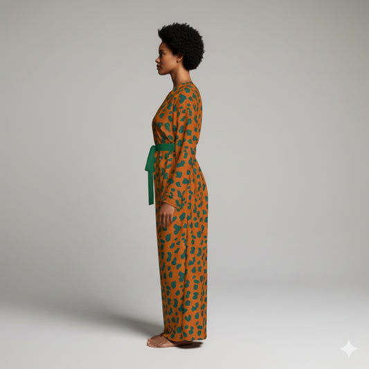 Ecovero Kimono-Sleeve Abaya: Orange & Green Micro-Print