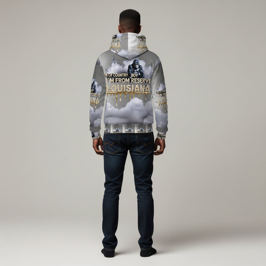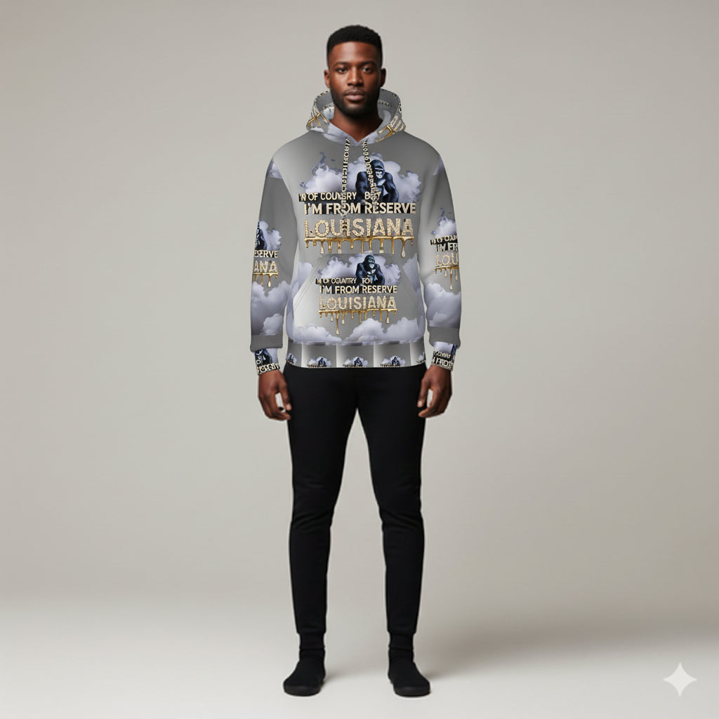 This is more than a hoodie—it's a cultural manifesto. Designed in heavyweight organic cotton spandex French terry, it fuses comfort with presence. The all-over digital print features bold "I'M OF COUNTRY BOY, I'M FROM RESERVE LOUISIANA" statements, accented by gold-drip lettering and photo-real grayscale portraiture, all anchored in moody, atmospheric clouds. Engineered for visionaries who know place is provenance, every detail ignites dialogue. Curated for the ones rewriting the narrative—welcome to streetwear’s creative renaissance.