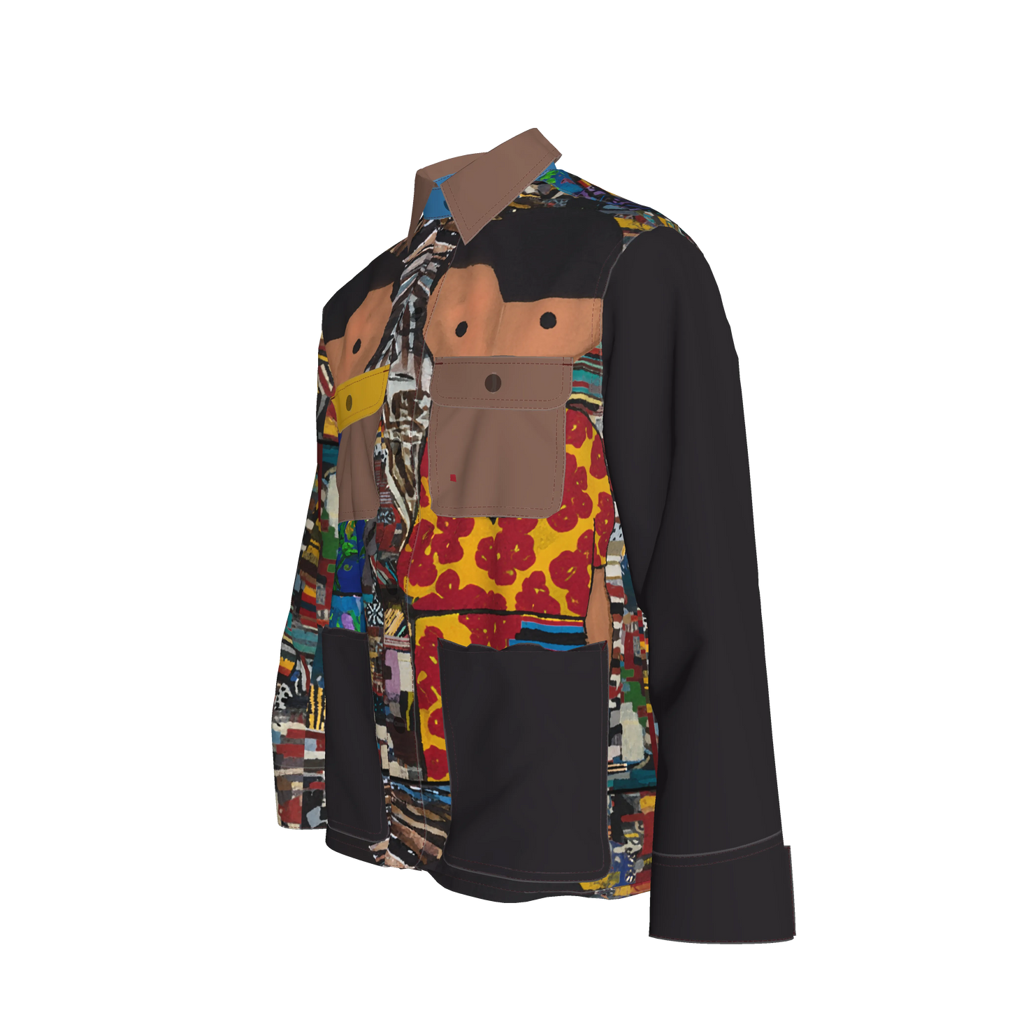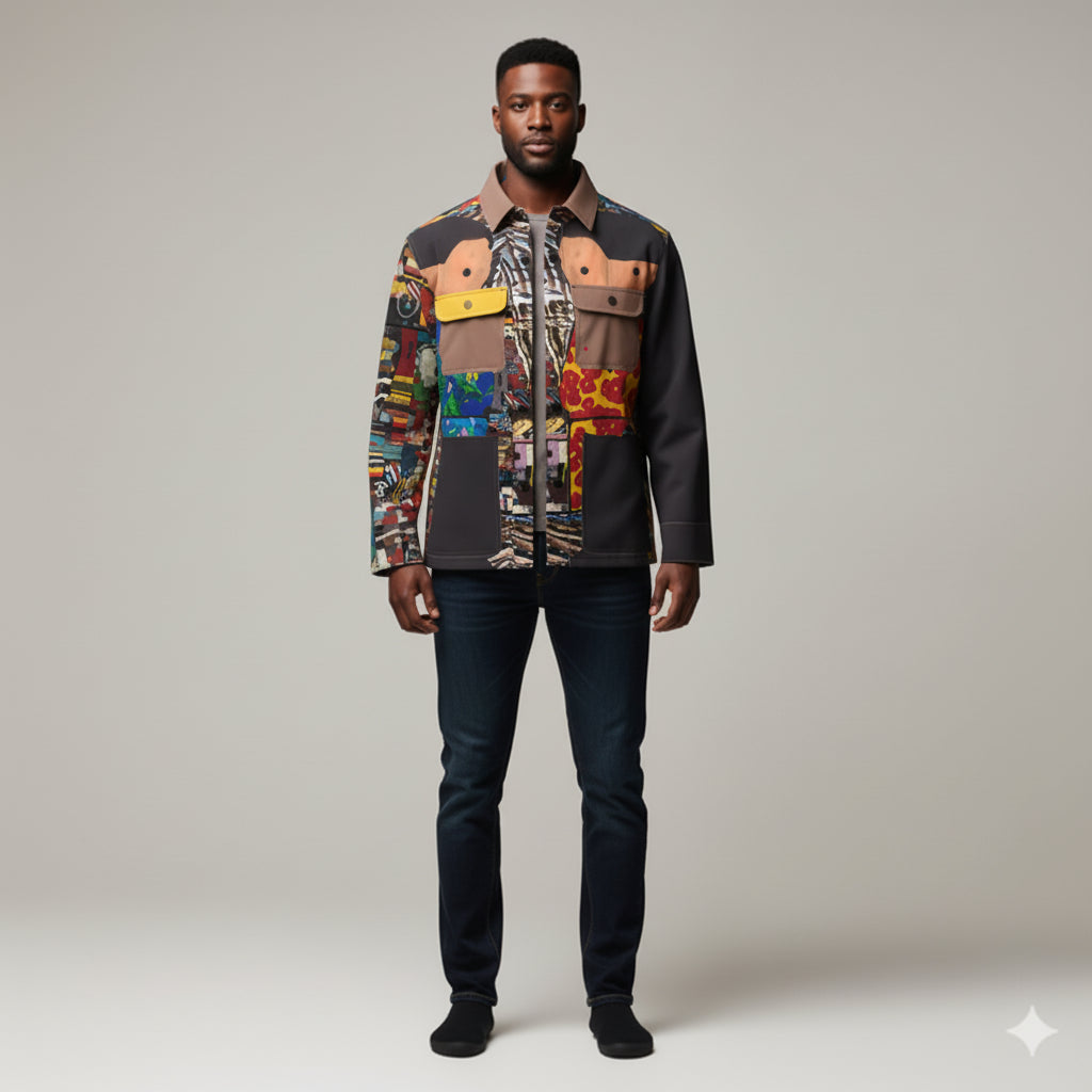 Stand out in our Chore Coat, crafted from heavy stretch cotton twill for flexible comfort and structure. The playful collage of patterns—patchwork prints, abstract stripes, and bold blocks of red, yellow, blue, and green—makes this jacket a true statement piece. Eye-catching features include contrasting front pockets in brown, yellow, and navy, and unique motifs like florals, faces, and geometric shapes. Blending 97% cotton with 3% spandex, this coat promises durability and easy movement. Layer it with your favorite essentials for an instant style upgrade that’s as comfortable as it is unique.